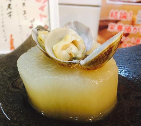 おでんの出汁はかつお、こんぶ、にぼし、野菜、しいたけ、あさりの6種類。透き通った出汁なのに、味わい深い旨味が特徴です。